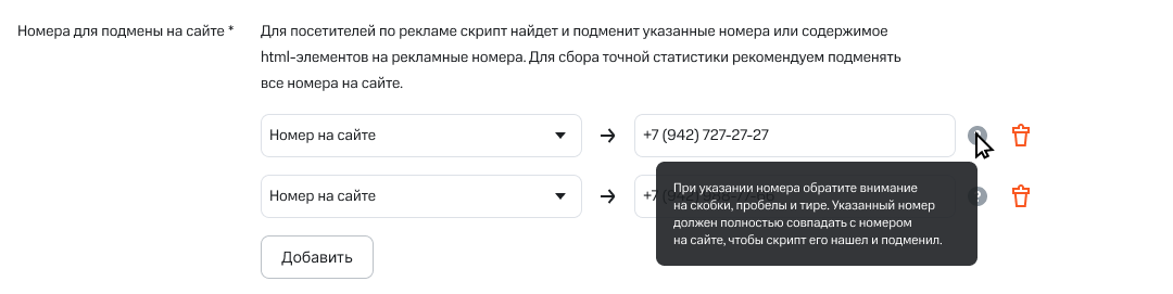 В нашем примере не подменился один из номеров. Чтобы исправить ошибку, мы копируем номер с сайта и вставляем его в настройки коллтрекинга.