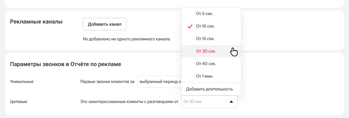 В блоке «Целевые звонки» выберите, звонки какой длительности стоит отслеживать в результатах рекламной кампании.