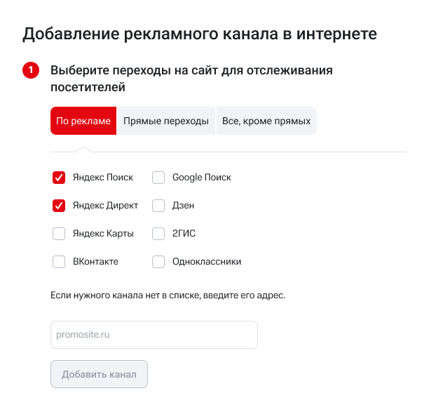 При выборе переходов по рекламе откроется список рекламных каналов. Выберите один или несколько каналов, переходы с которых хотите отслеживать с одного номера.