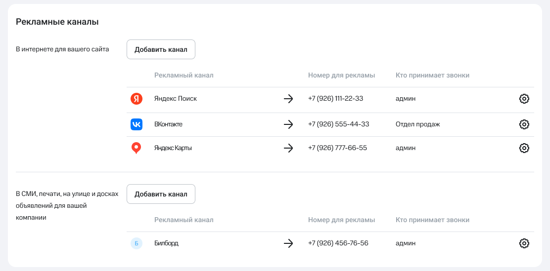 • с разделением по рекламным каналам через несколько номеров — для одновременного запуска рекламы через несколько каналов.