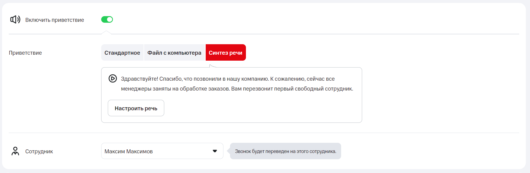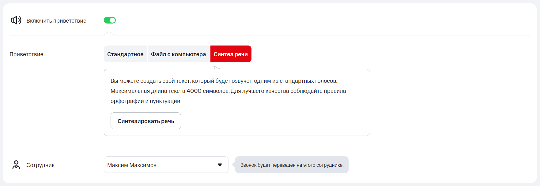 Вы можете заменить приветствие в любой момент, отредактировав текст сообщения на вкладке «Синтез речи». Также вам всегда доступно стандартное приветствие и возможность загрузить до 40 собственных файлов приветствий.
