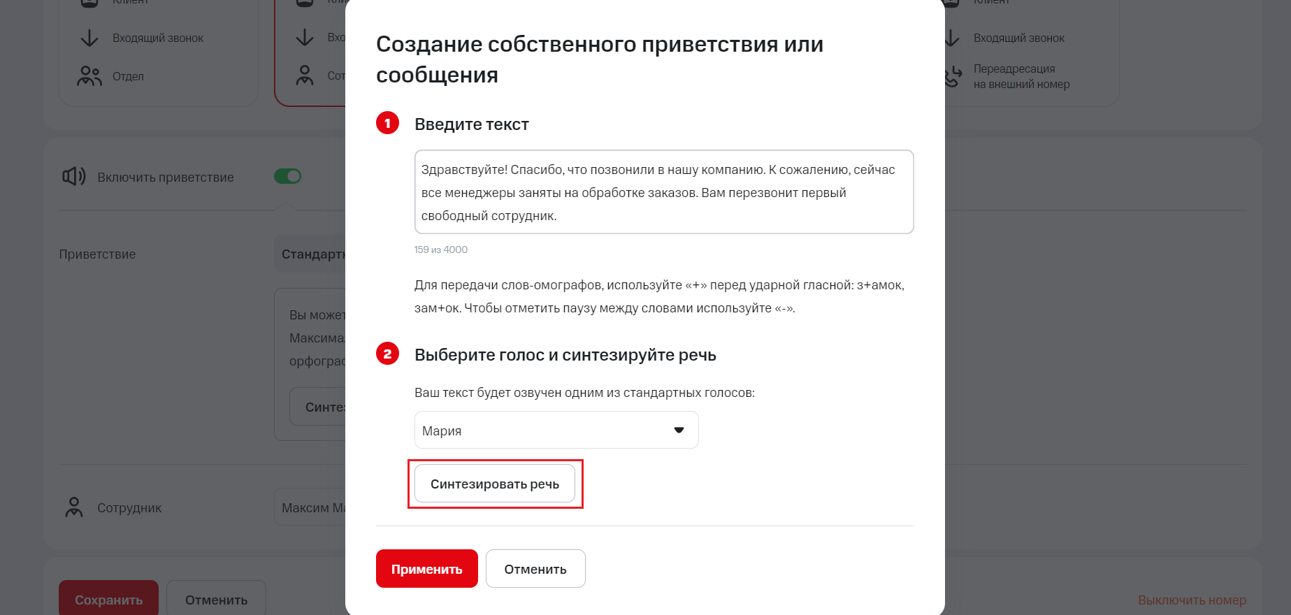 2. Введите текст приветствия, выберите голос, который озвучит ваш текст, и нажмите кнопку «Синтезировать речь».