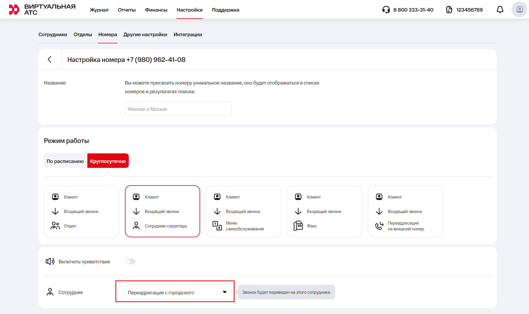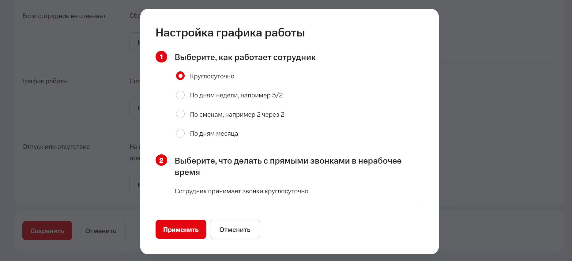 2. Выберите, как работает сотрудник. Переадресация прямых звонков на автоответчик доступна для всех графиков работы, кроме круглосуточного.