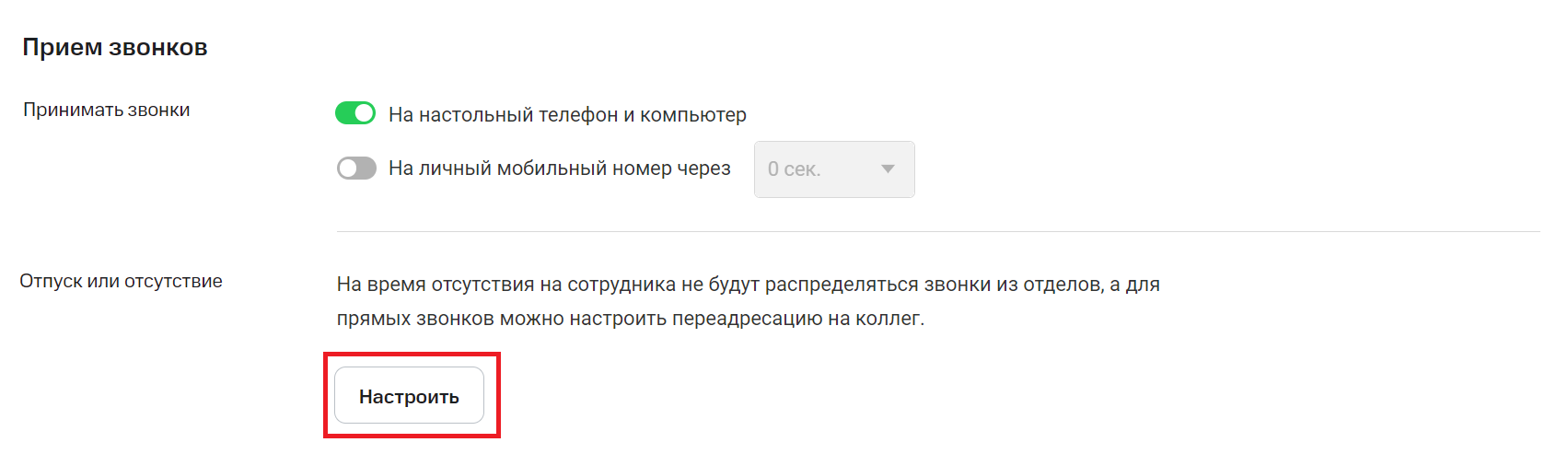 1. В блоке «Прием звонков» у подзаголовка «Отпуск или отсутствие» кликните на кнопку «Настроить».