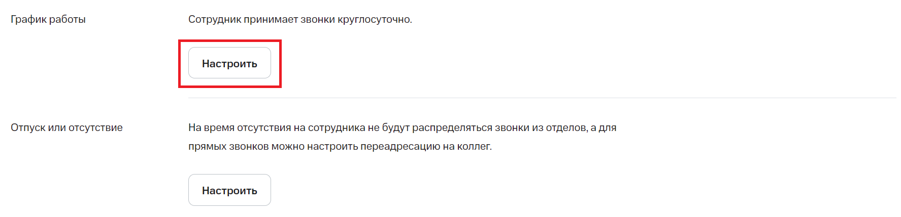 1. В блоке «Прием звонков» у подзаголовка «График работы» кликните на кнопку «Настроить».