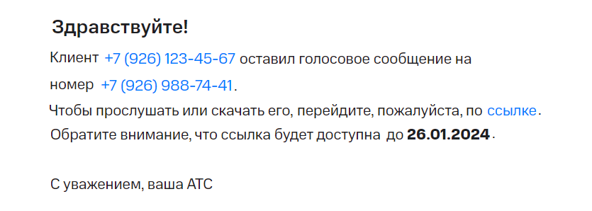 Если вы указаны в качестве получателя сообщений автоответчика, то после того, как клиент или сотрудник оставит голосовое сообщение, вы получите письмо со ссылкой для прослушивания. Ссылка на голосовое сообщение будет доступна в течение 7 дней с момента получения электронного письма.