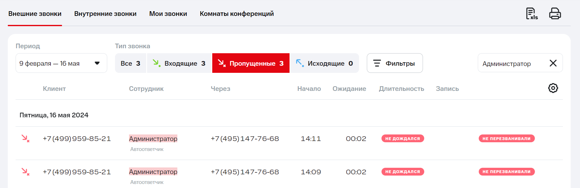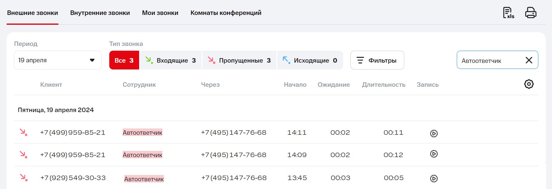 Если вы хотите найти все сообщения, оставленные на персональный автоответчик конкретному сотруднику, напишите в строке поиска его имя и выберите тип звонков «Пропущенные».