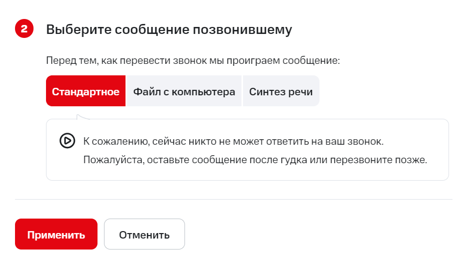 По умолчанию Виртуальная АТС будет проигрывать стандартное сообщение с предложением оставить голосовую почту, но вы в любой момент можете заменить его на свой файл с компьютера или озвучить текст сообщения на автоответчик с помощью функции «Синтез речи».