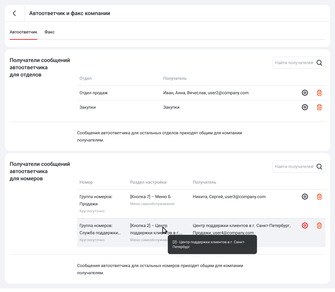 Чтобы удалить настройки автоответчика, в разделе «Автоответчик и факс компании» нажмите на корзину справа от номера или отдела, для которого автоответчик настроен.