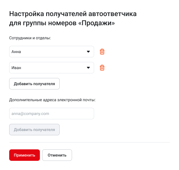 Чтобы изменить настройки, кликните на шестеренку справа от выбранного номера. В открывшемся окне вы можете добавить или удалить получателей автоответчика, а также указать дополнительные электронные адреса, куда будут отправляться голосовые сообщения.