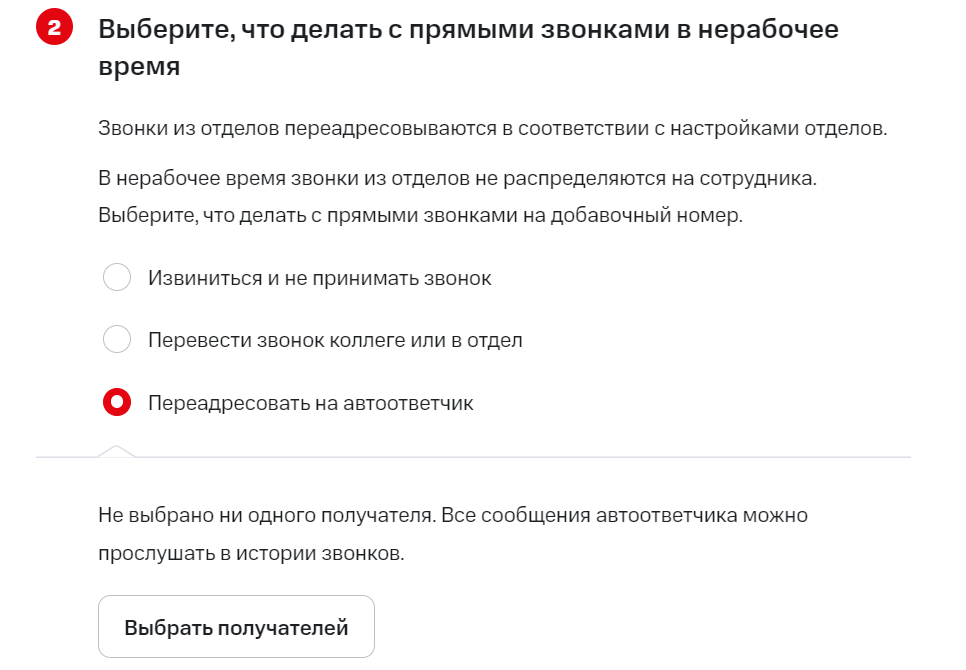 3. Настраивая действия с прямыми звонками в нерабочее время, выберите «Переадресовать на автоответчик».