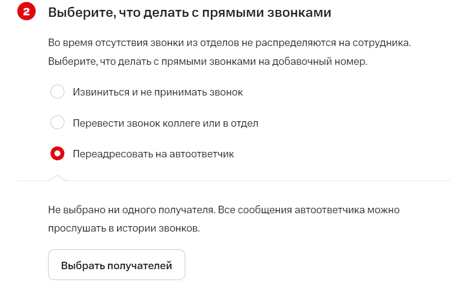 4. По умолчанию при нажатии на кнопку «1» звонок будет направляться на общий автоответчик компании. Чтобы изменить настройки автоответчика, нажмите «Выбрать получателей».