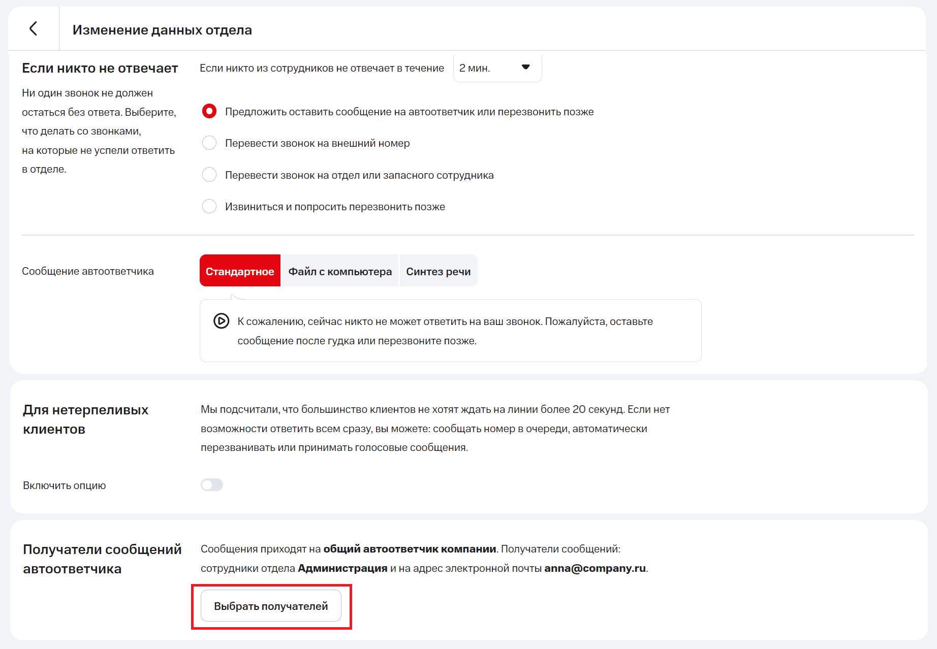 По умолчанию будет выбран общий автоответчик компании со списком получателей, который вы настраивали ранее. Чтобы изменить настройки автоответчика, в блоке «Получатели автоответчика» нажмите на кнопку «Настроить получателей».