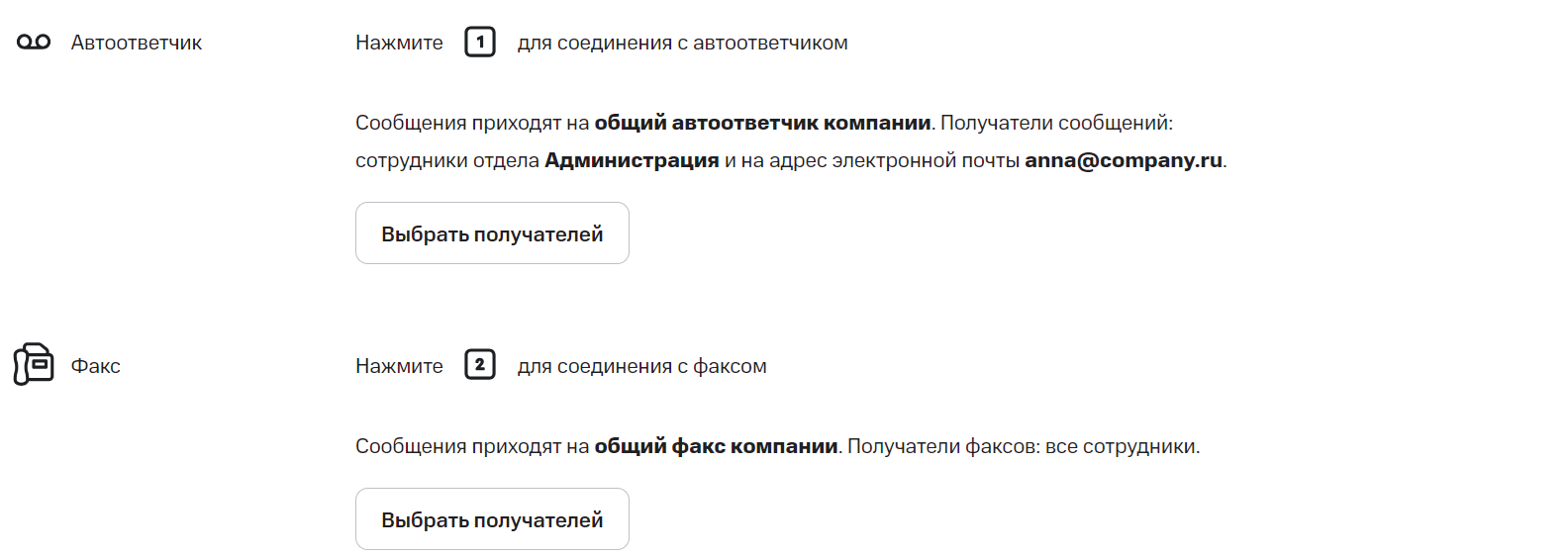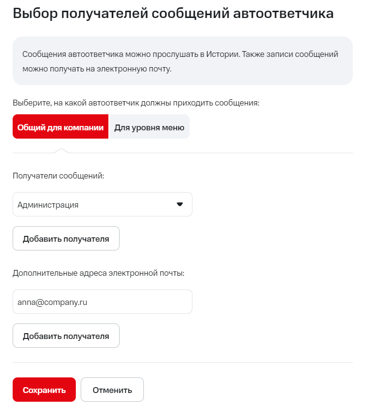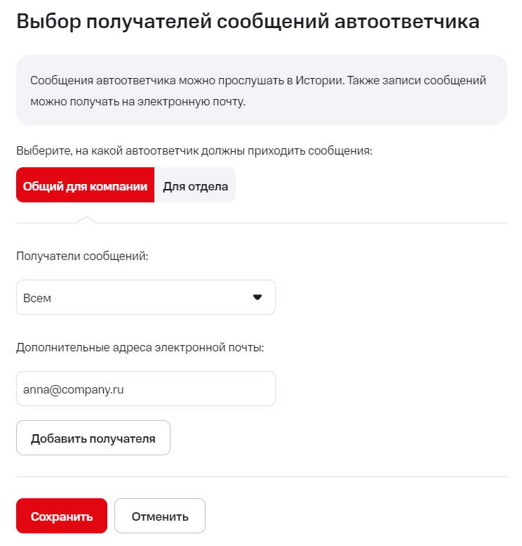 • Общий для компании — голосовые сообщения будут приходить всем получателям сообщений общего автоответчика компании;
