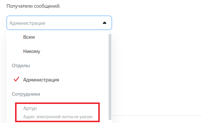 Если выбрать в списке получателей не конкретного сотрудника, а отдел, то голосовые сообщения будут направляться на электронные адреса всех сотрудников этого отдела, у кого указана почта в профиле.