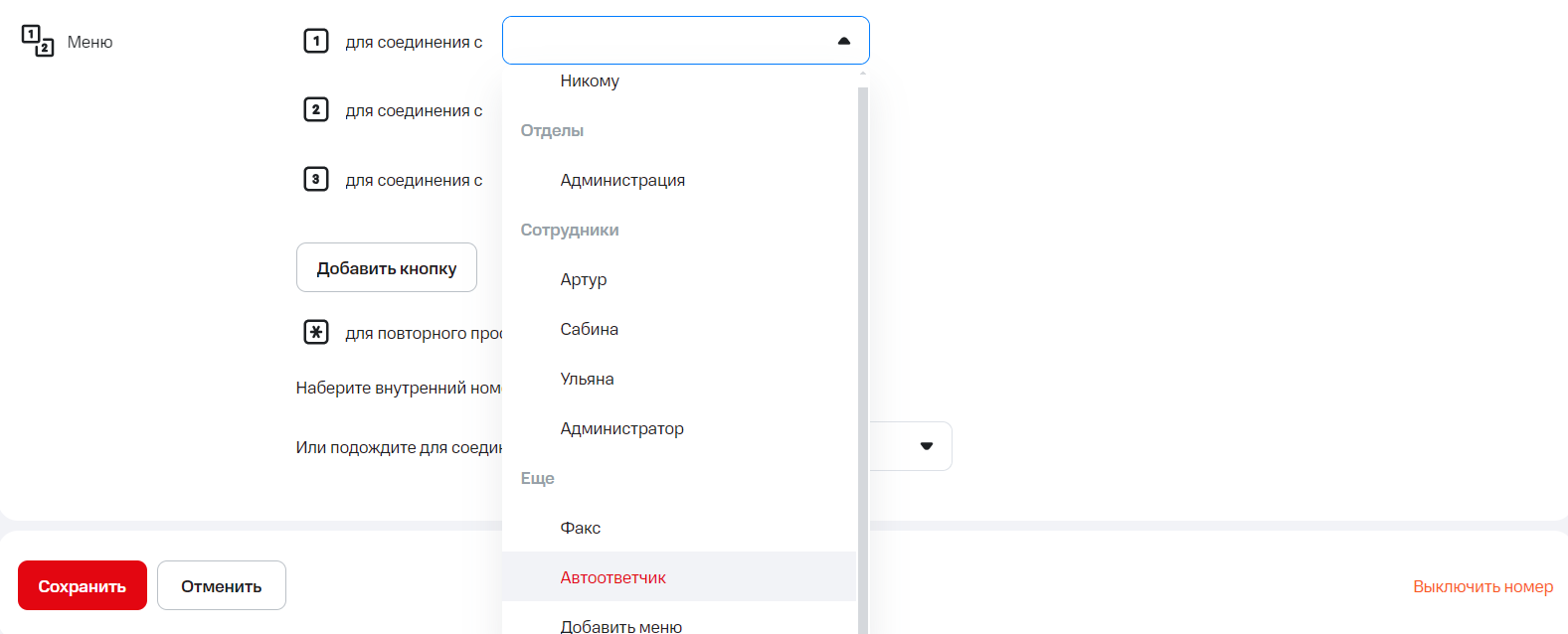 Для этого в настройках меню укажите, что при нажатии одной из кнопок вызов будет направлен на автоответчик.