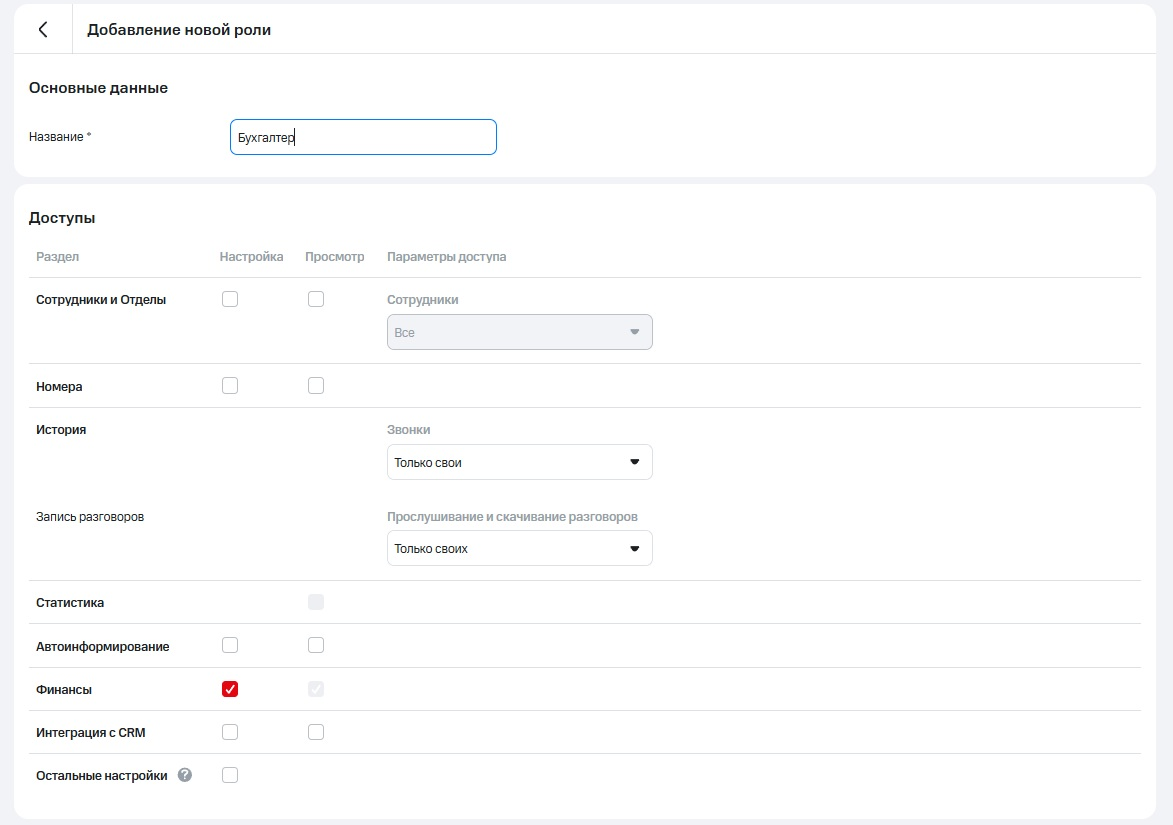 Выберите параметры для доступа к просмотру истории звонков и статистике (полный или только своего отдела), скачиванию истории (разрешить или запретить) и прослушиванию записей (все звонки или только свои).